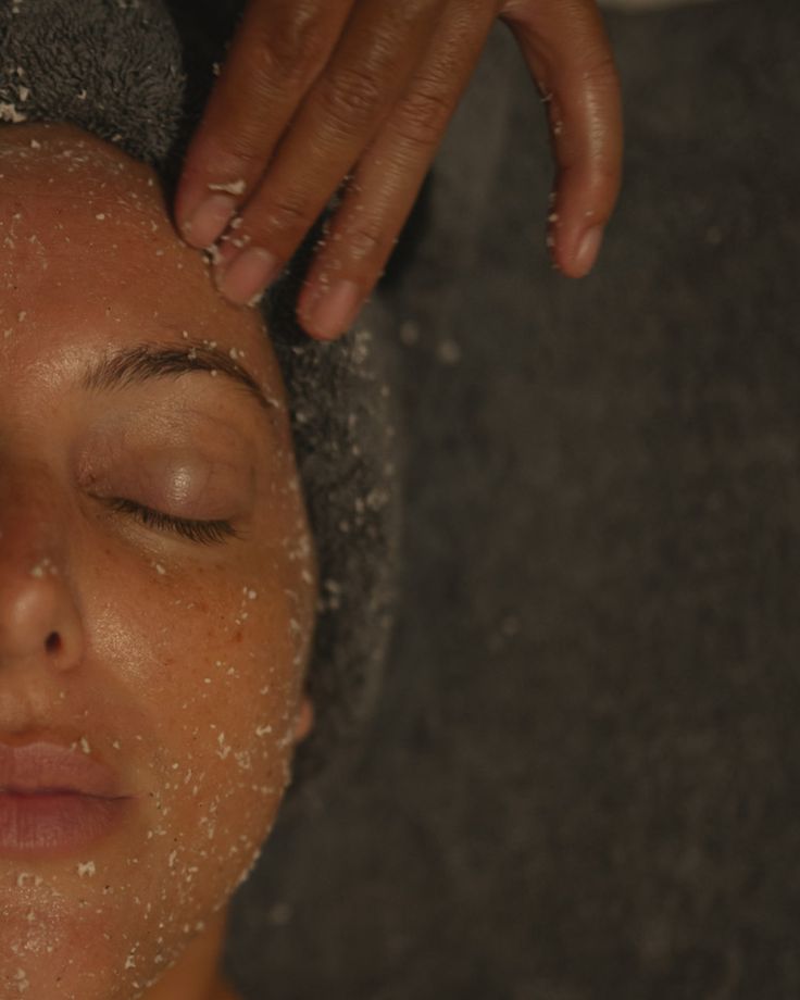 A gentle House made Papaya Sorbet Scrub is applied to lift away dead skin cells so your skin feels smooth and fresh.